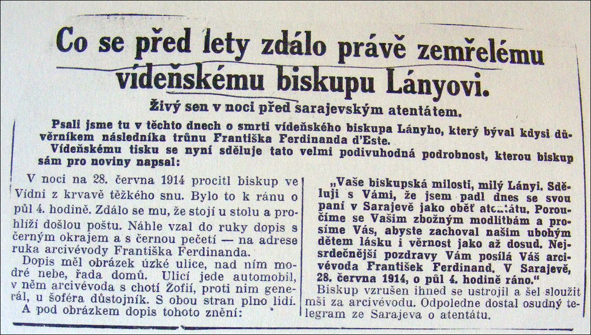 Vídeňský biskup a rodák ze slovenského Nitranska Josef Lányi de Késmárk měl jedné červnové noci roku 1914 živý sen.