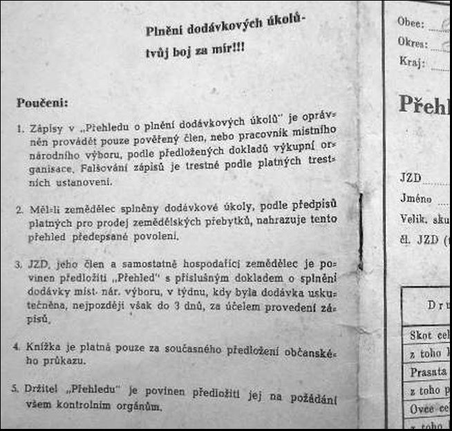 Zákon č. 56/1952 Sb., o dodávkových povinnostech a výkupu zemědělských výrobků se stal totiž hlavním nástrojem persekuce samostatně hospodařících rolníků, když nastavil předepsané dodávky obilí, brambor, ale i mléka a masa zemědělcům tak, že značně přesahovaly jejich reálné možnosti. Pokud dodávky rolník nesplnil, často následovalo jeho trestní stíhání a nezřídka i vězení a propadnutí majetku.